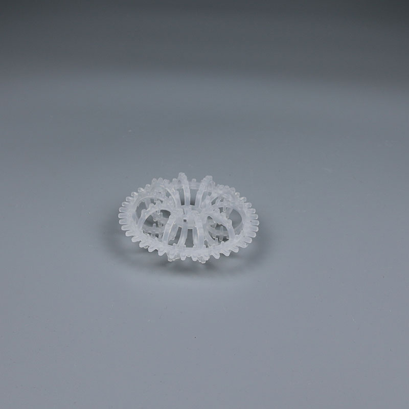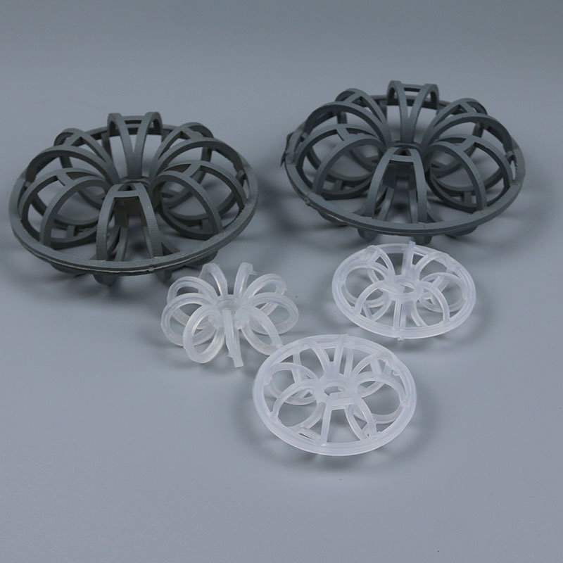 塑料花環(huán)填料最早是由美國A.J.Teller于1954年研制開發(fā)出來的,因此花環(huán)也經(jīng)常被稱為泰勒花環(huán)填料(Teller Rosette)。塑料花環(huán)填料用的最多是聚丙烯花環(huán)填料。塑料花環(huán)填料是由許多圓環(huán)結(jié)繞而成,由于填料的空隙處能有較高的持液量,可使塔內(nèi)液體的停留時(shí)間較長,從而增加了氣液兩相的接觸時(shí)間,提高了填料的傳質(zhì)效率?;ōh(huán)填料具有空隙率大,壓降和傳質(zhì)單元高度低,泛點(diǎn)高,汽液接觸充分,比重小,傳質(zhì)效率高等特點(diǎn),多用于氣體洗滌、凈化塔中。